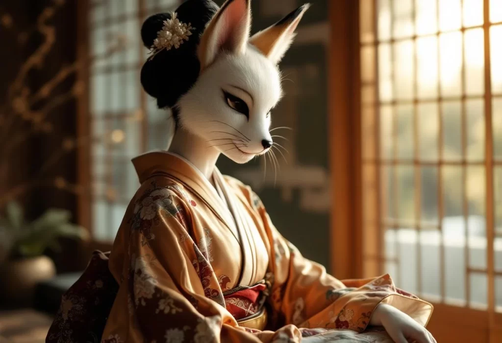Kimono haute couture et masques kitsune : mariage parfait entre mystère et élégance