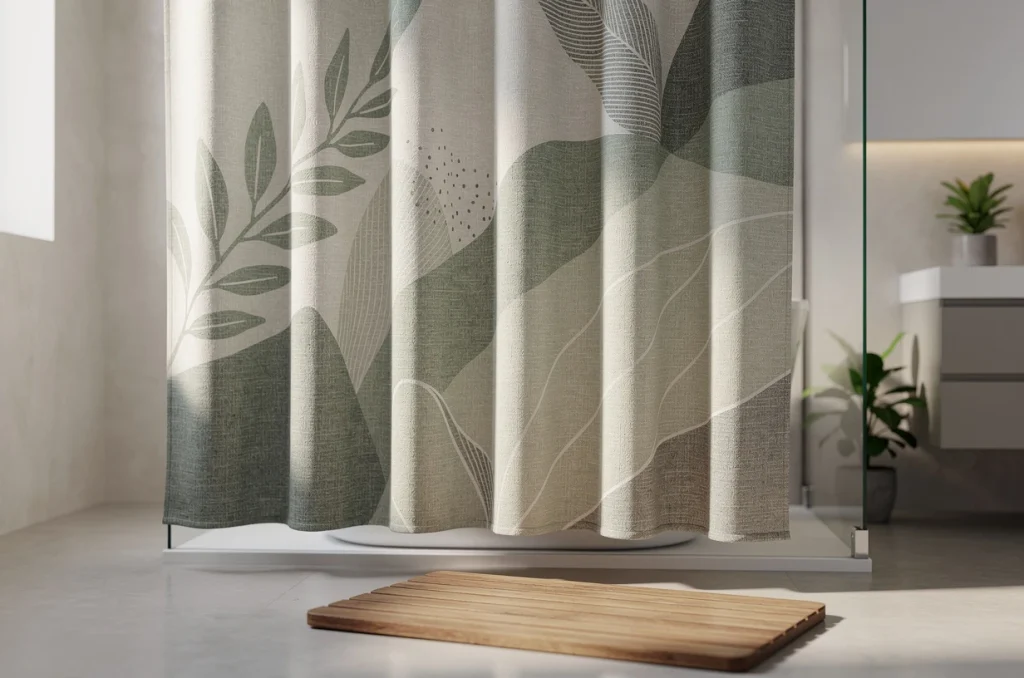 Baigner dans une ambiance nature transforme la routine quotidienne du matin en moment apaisant. Un rideau de douche orné d’un motif végétal invite la verdure dans la salle de bain. Feuilles stylisées, impressions forestières ou plantes tropicales attirent l’œil sans surcharger la pièce.